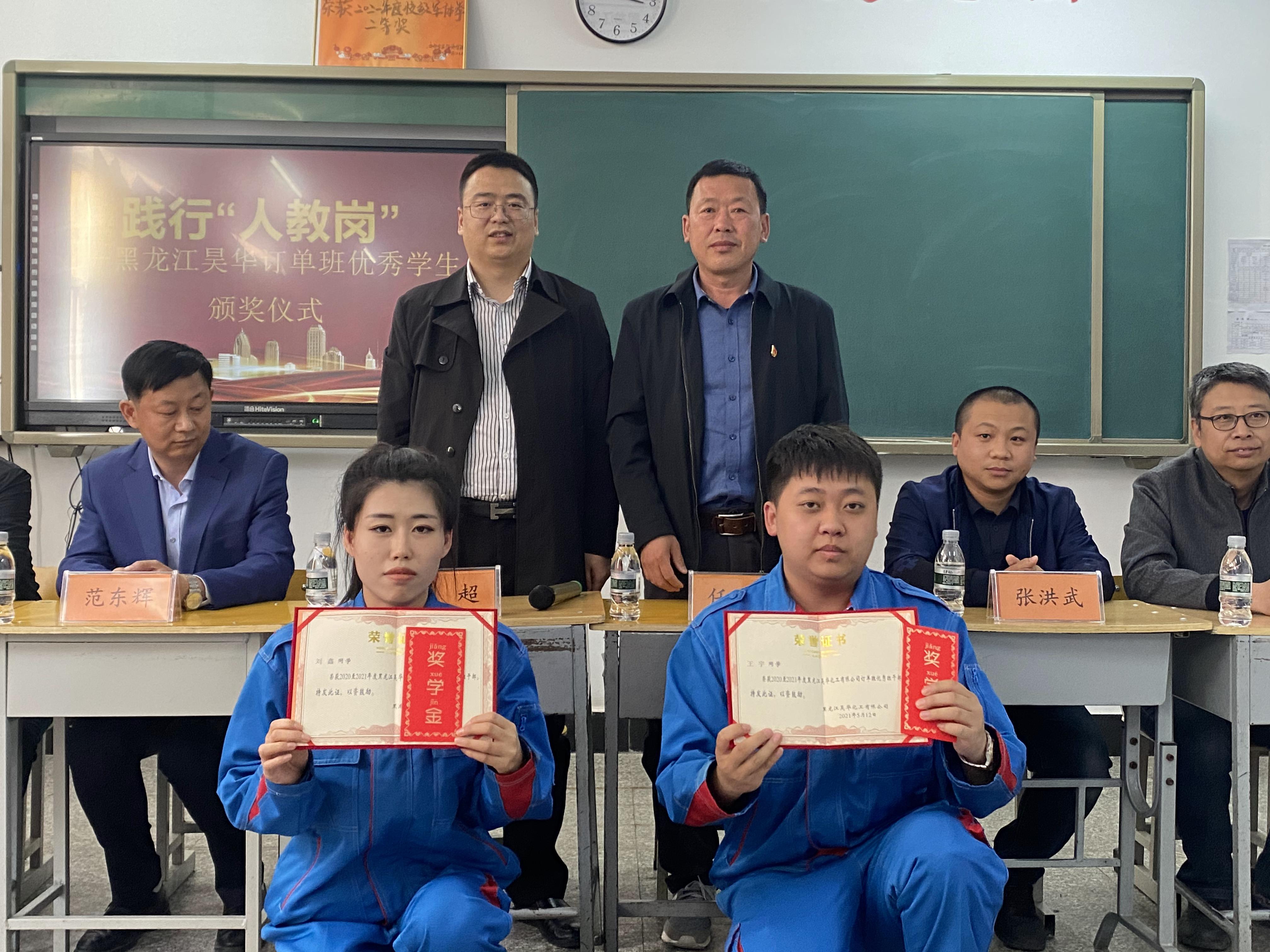 践行“人教岗”——昊华订单班优秀学员颁奖仪式于下午3点在昊华班教室准时召开,43名学员身着我公司工装整齐划一、激情饱满,班级墙面的布置充满了我公司企业文化的内涵。齐齐哈尔市机电工程系主任蔺心书主持了颁奖仪式。